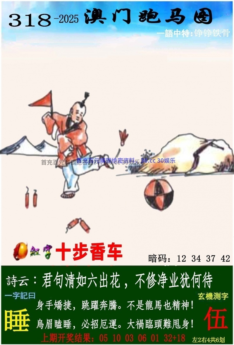 318期一字記曰《睡》 身手矯捷,跳躍奔騰。不是龍馬也精神!烏眉瞌睡,必招厄運。大禍臨頭難甩身! 解:图片显示一个小孩在踢毽子解出小数01-24.本期红字带来的是十步香车的意思是比喻处处都有人才,通过十步与香车的意象组合,暗含人才分布密集之意诗词的意思是大祸临头难甩身这一现象,又与龙马的运势密切相关,龙马是大水的象征,象征着大逆不反、大灾大祸,但也意味着好运连连。大祸临头难甩身并不是一种不可避免的厄运,而是一种需要耐心等待好运的运势 综合取肖:鸡猪牛狗虎鼠猴 |