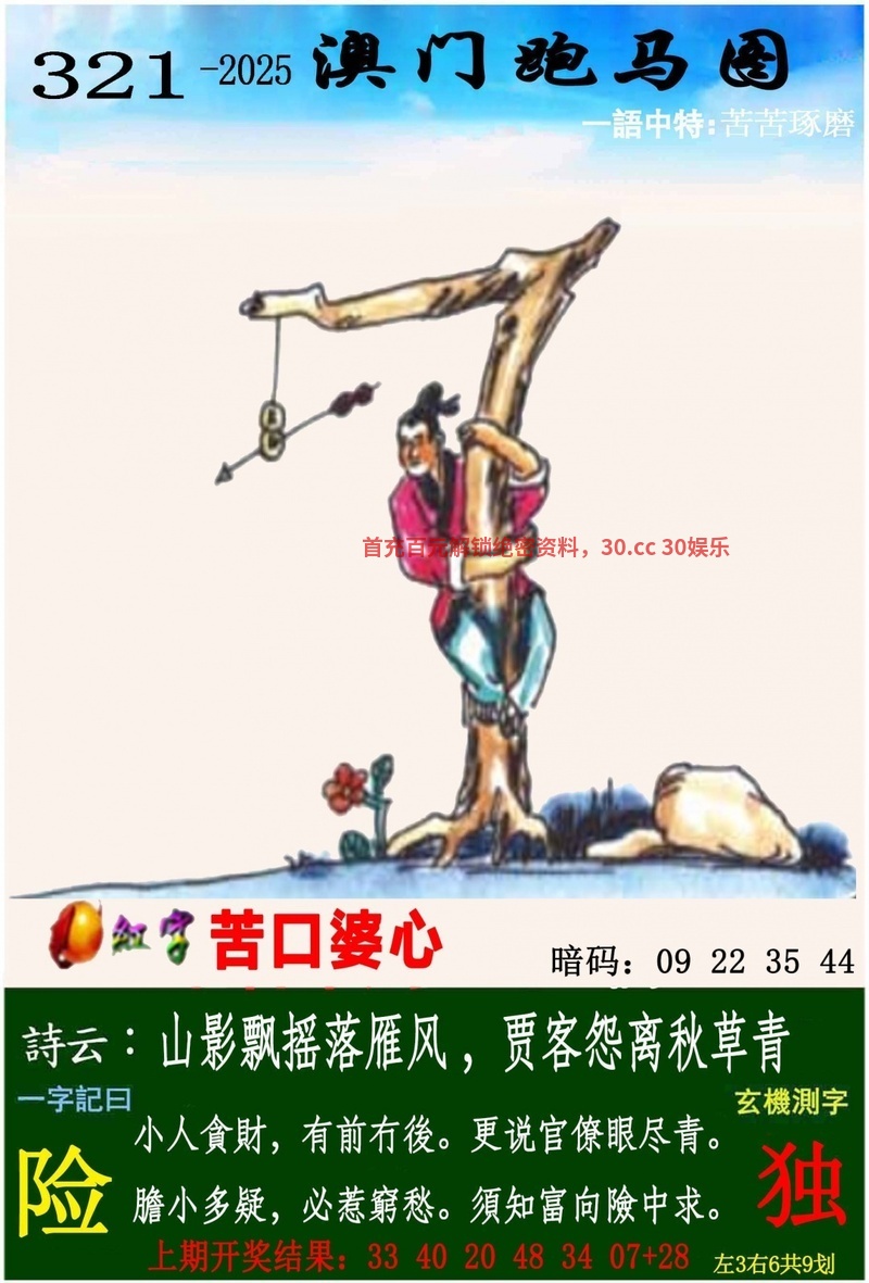 321期一字記曰《险》 小人貪財,有前冇後。更说官僚眼尽青。膽小多疑,必惹窮愁。須知富向險中求。 解:图片显示一个男子趴在树上解出木肖虎兔,本期红字带来的是苦口婆心的意思是不厌其烦地反复劝说与开导;婆心:老婆婆的心肠;指好意、善意。好心好意;不厌其烦地劝说或开导。形容耐心恳切地再三规劝诗词的意思是指获取财富需敢于冒险的处世观念。该俗语强调财富积累与风险承担之间的必然联系,认为突破常规的冒险行为是实现经济利益的重要途径,体现了传统社会对利益获取方式的认知逻辑 综合取肖:虎兔羊鸡猴猪鼠 |